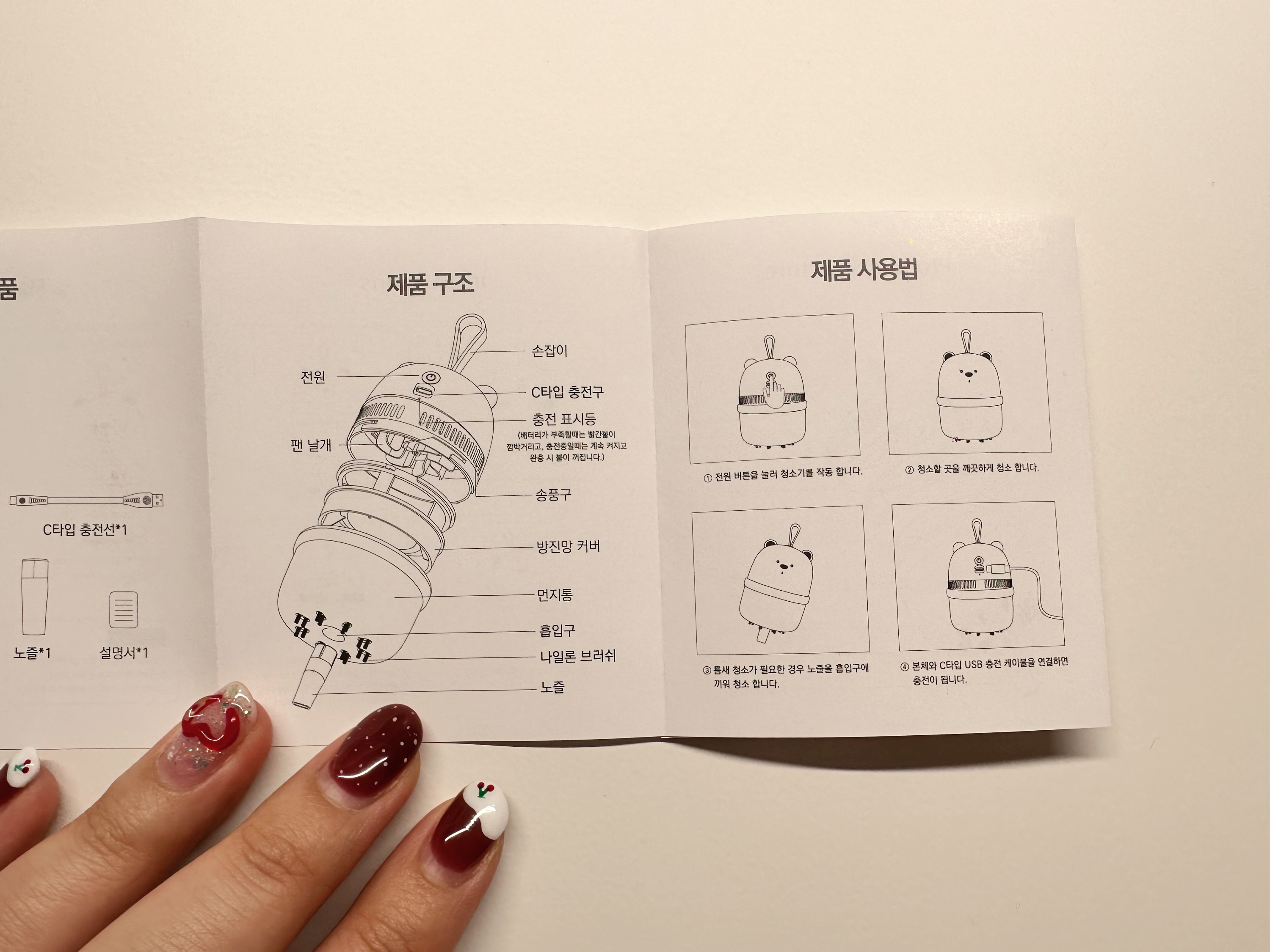 구성품은 본체랑 C타입 USB 케이블, 설명서가 있어요