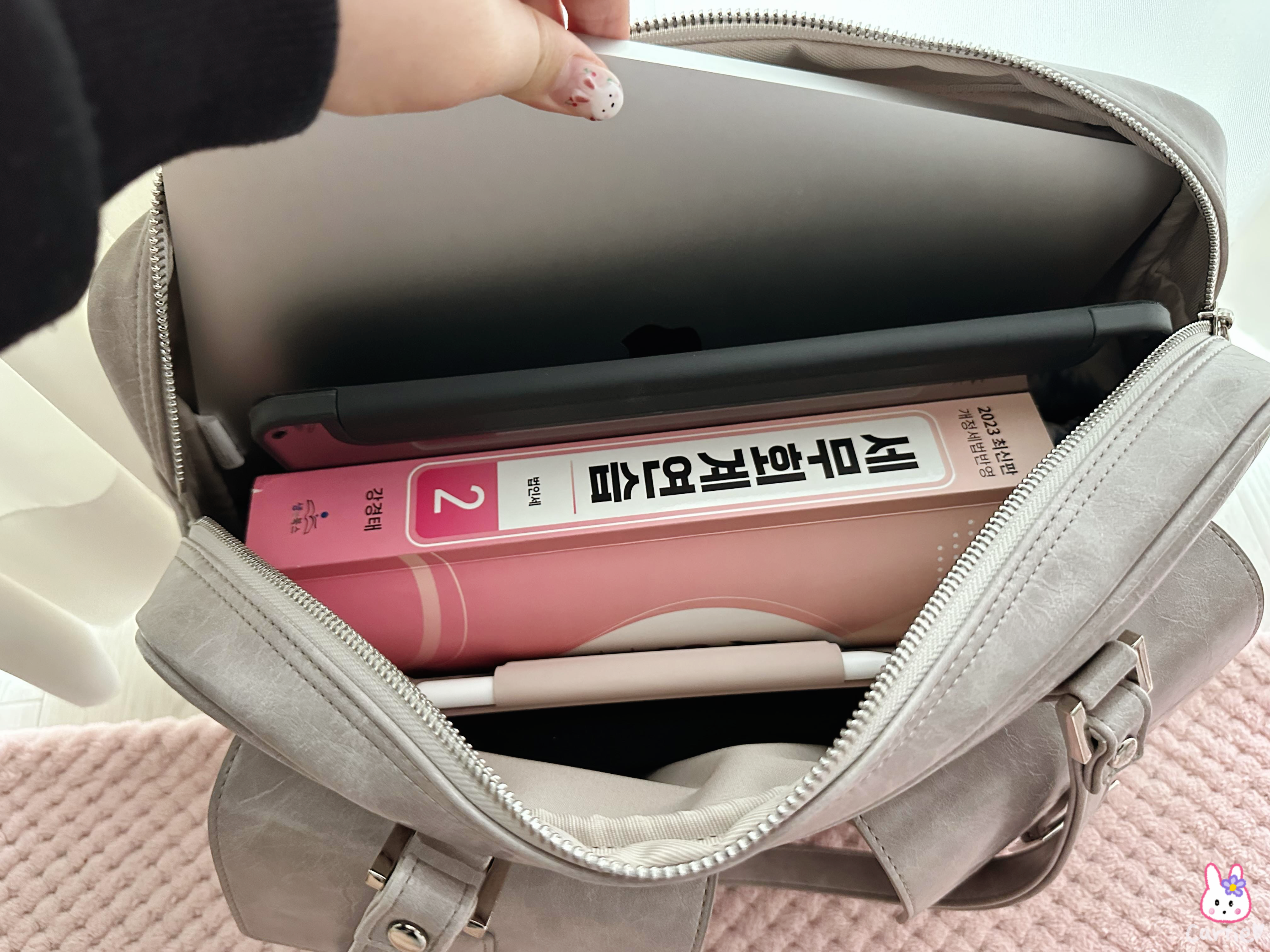 맥북이랑 아이패드 미니랑 계산기, 필통, 충전기, 책 한두권정도 들고다니는데